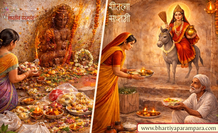 स्कंद पुराण के अनुसार माँ शीतला दुर्गा और माँ पार्वती का ही अवतार हैं। ये प्रकृति की उपचार शक्ति का प्रतीक हैं। इस दिन भक्त अपने बच्चों के साथ माँ की पूजा आराधना करते हैं जिसके फलस्वरूप परिवार प्राकृतिक आपदा तथा आकस्मिक विपत्तियों से सुरक्षित रहता है।